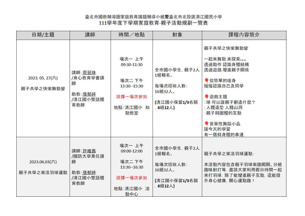 三、本活動錄取人數每場次16組32名 (清江國小保留1/3名額共 12人),如報名人數眾多則採抽籤方式辦理。