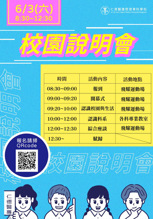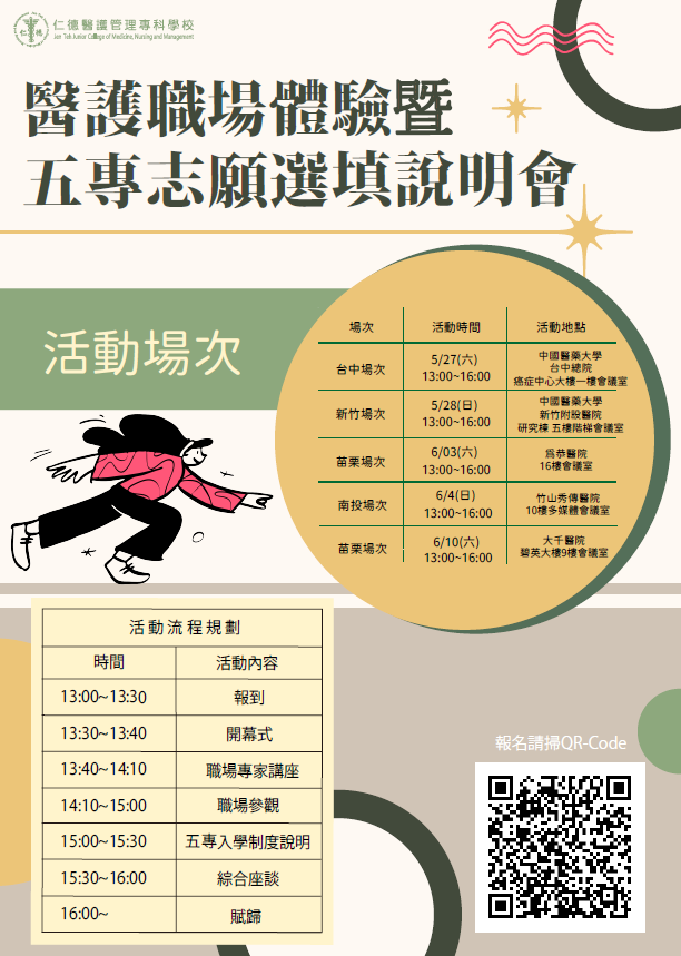 活動報名網址如下: (一)醫護人員職場體驗暨入學說明會:https://forms.gle /3aWeP8UiWGAyc7nc7