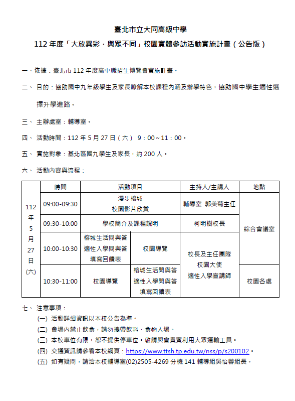 (二)現場報名:請於5月27日(週六) 上午9:00~9:30逕至臺北市立大同高級中學綜合會議室報到。