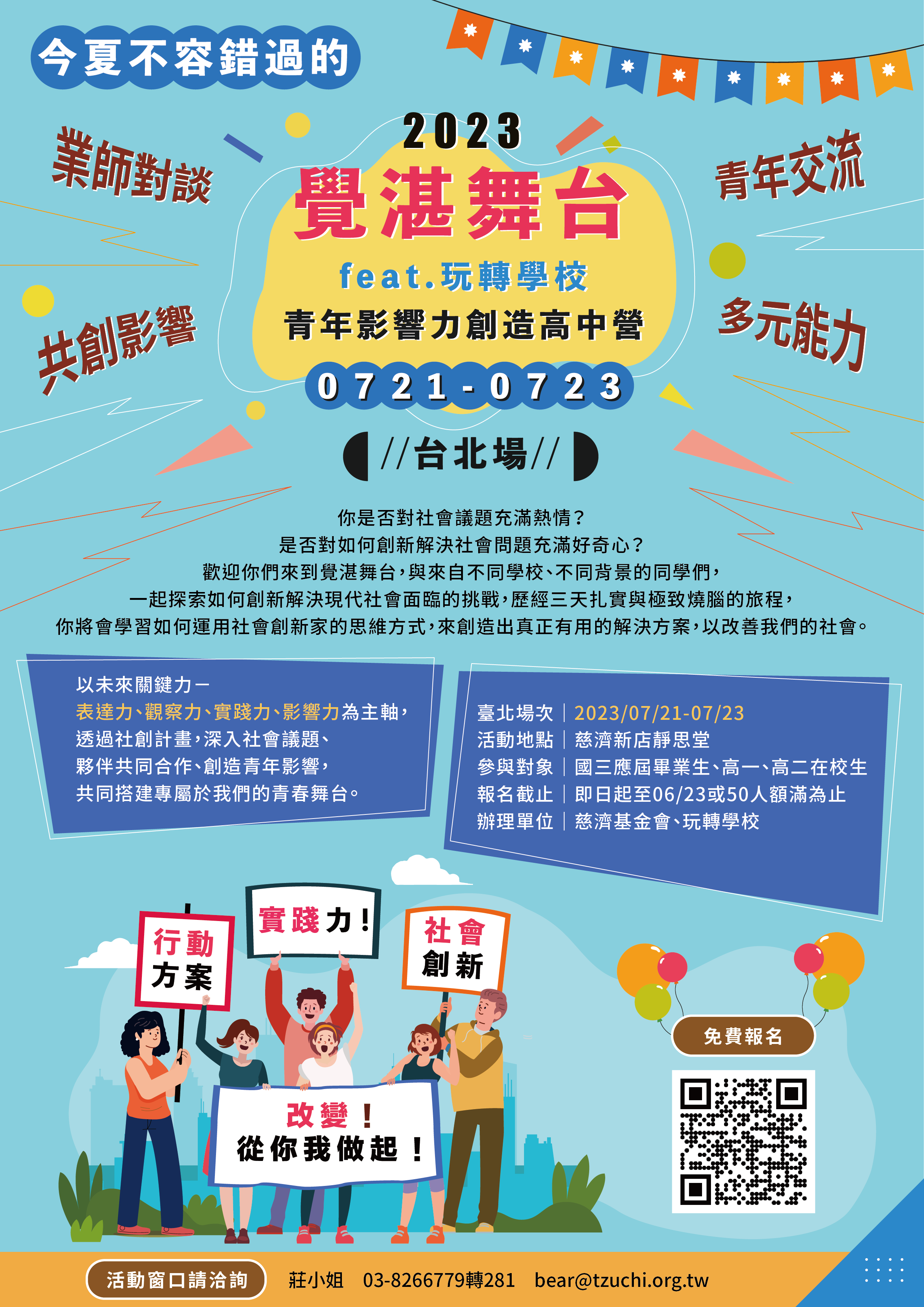 財團法人中華民國佛教慈濟慈善事業基金會舉辦2023年「覺湛舞台-青年影響力創造高中 營」台北場次,詳見附件!