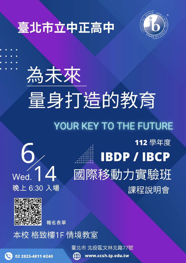 一、該校謹訂於112年6月14日(星期三)18:30~20:00,實體辦理 「為未來量身打造的教育(Your Key To The Future)」國際移動力實驗班IBCP、IBDP)招生說明會。