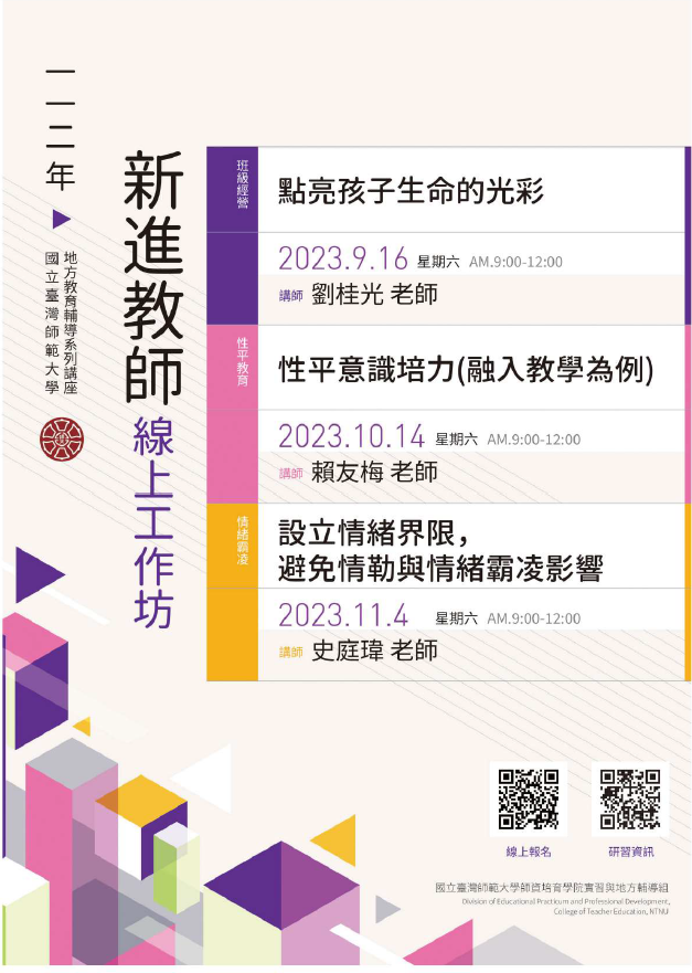 (一)第1場次:112年9月16日(星期六)上午9時至12時,主 題:班級經營-點亮孩子生命的光彩,