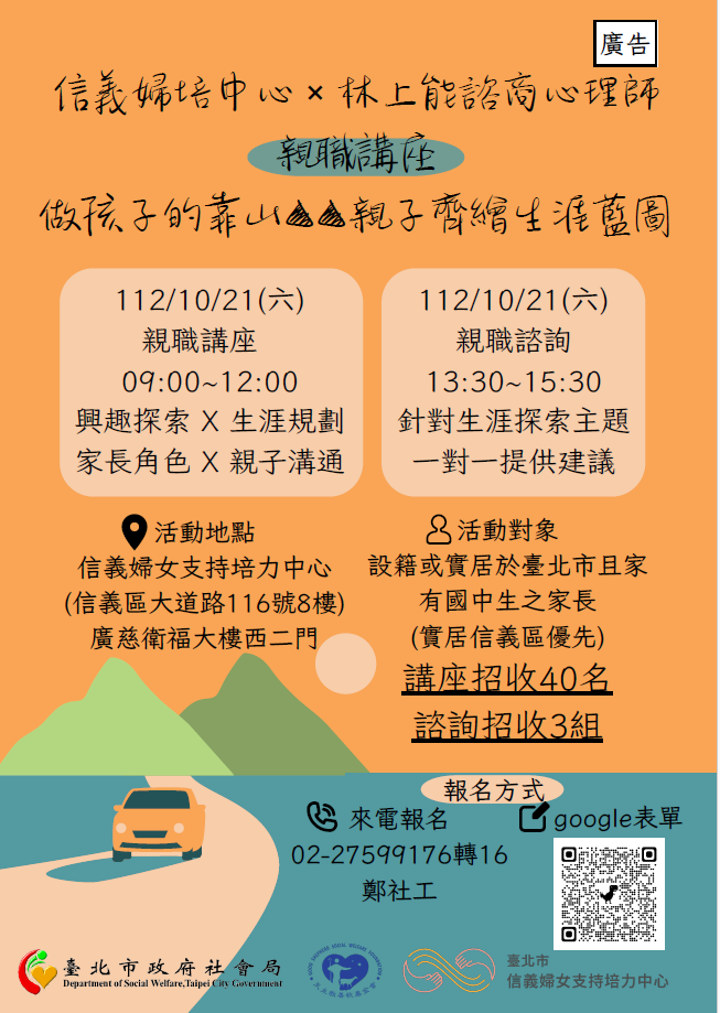 臺北市信義婦女支持培力中心訂於112年10月21日(六), 上午9:00至15:30,於該中心大禮堂(地址:臺北市信義區 大道路116號8樓)辦理「親職講座暨諮詢 做孩子的靠山 親子齊繪生涯藍圖」活動,請踴躍參加。