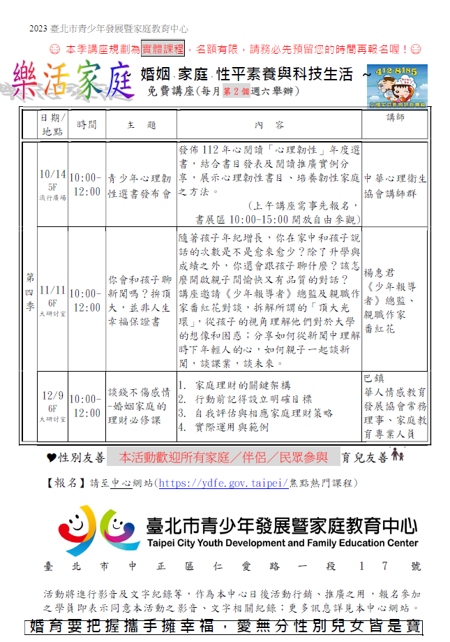青發家教中心免費講座:10/14青少年心理韌性選書發布會暨書展、11/11你會和孩子聊新聞嗎?拚頂大並 非人生幸福保證書、12/9談錢不傷感情-婚姻家庭的理財 必修課,歡迎上網查詢。