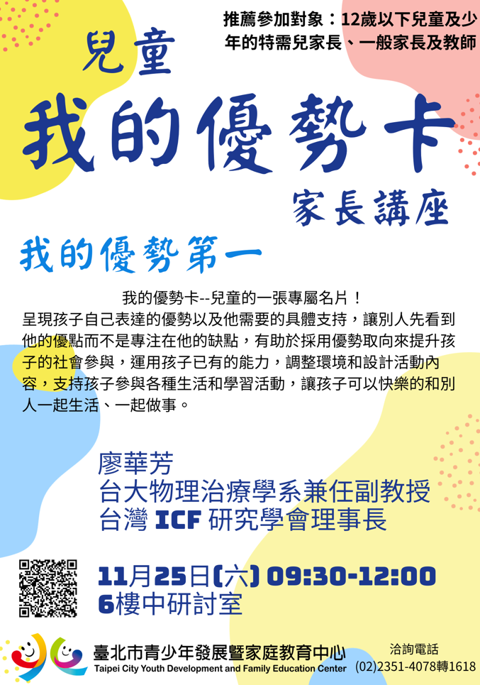 「我的優勢第一!」協助家長看見兒童的優勢, 運用兒童優勢參與學習和生活,臺北市青少年發展暨家庭教育中心11月25日上午舉辦兒童「我的優勢卡」家長 講座,歡迎報名參加,詳情可上網查詢。