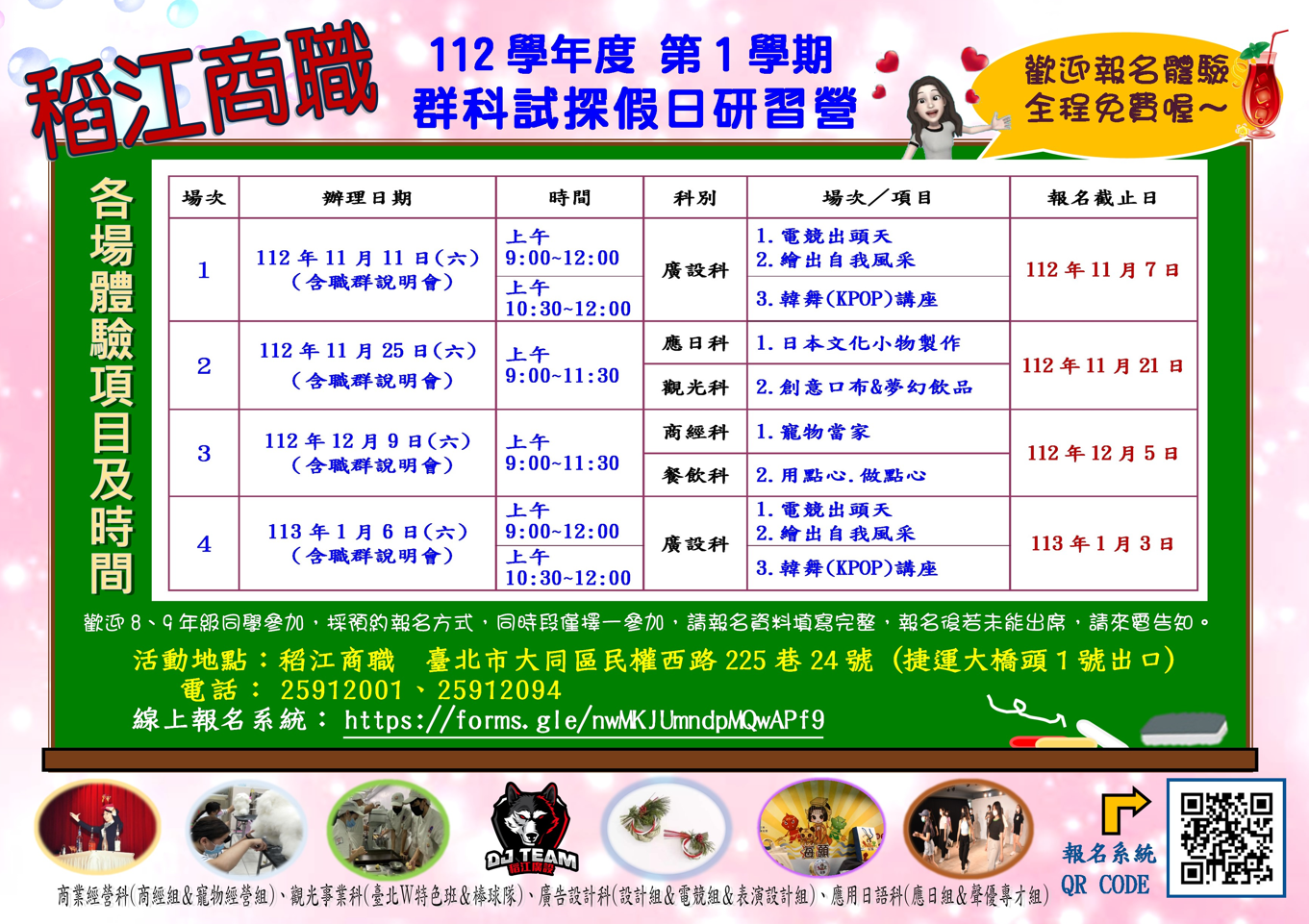 歡迎國中生踴躍至線上報名https://forms. gle/nwMKJUmndpMQwAPf9,參加體驗,活動全程免費。