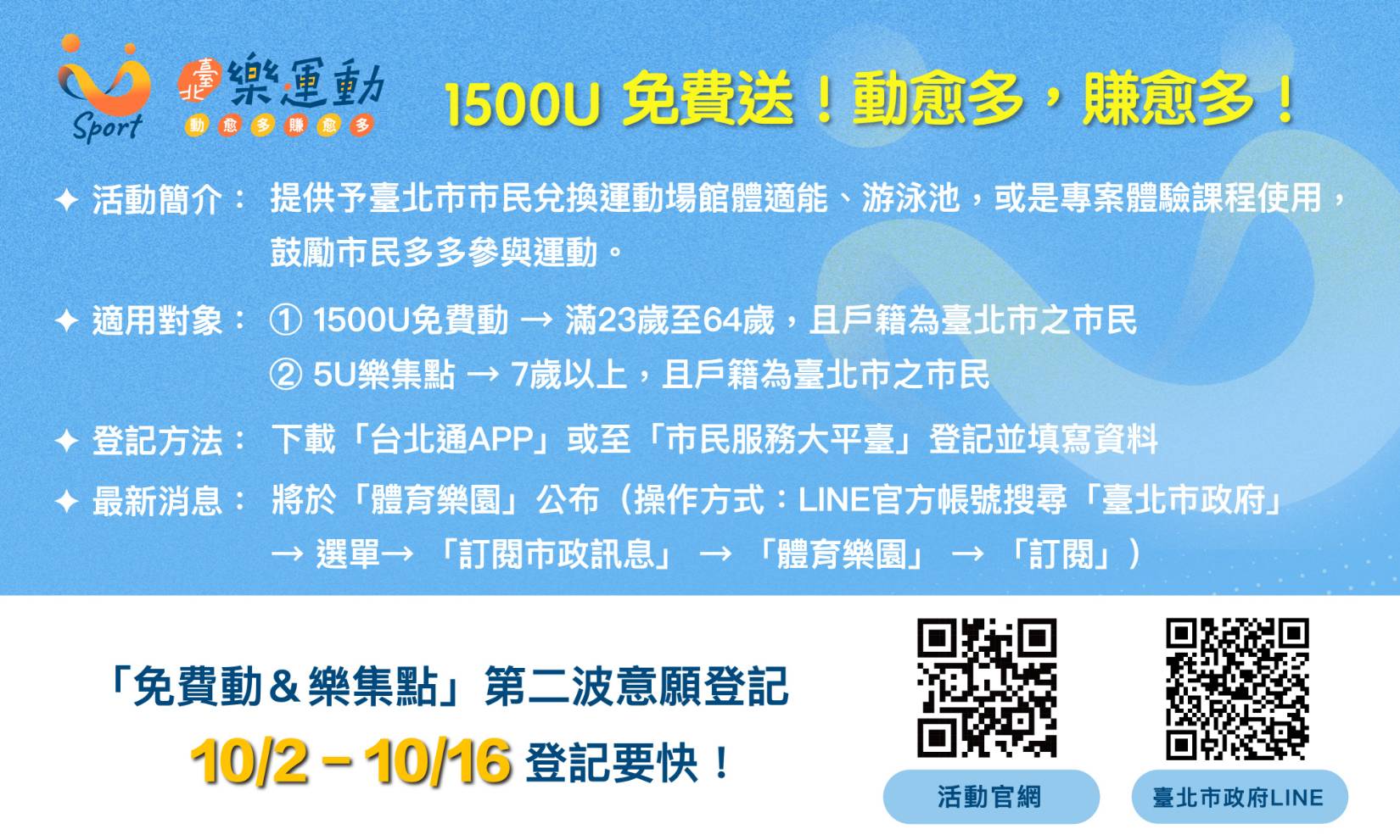 1.1500U免費動:23~64歲市民於活動期間內申請本次活動,經身分審核通過後將派發1,500運動點(U幣)至民眾台北通帳戶,民眾出示台北通通行證QRCode掃碼入場, 即可折抵運動場館健身房與游泳池單次入場使用費以及專案體驗課程費用。