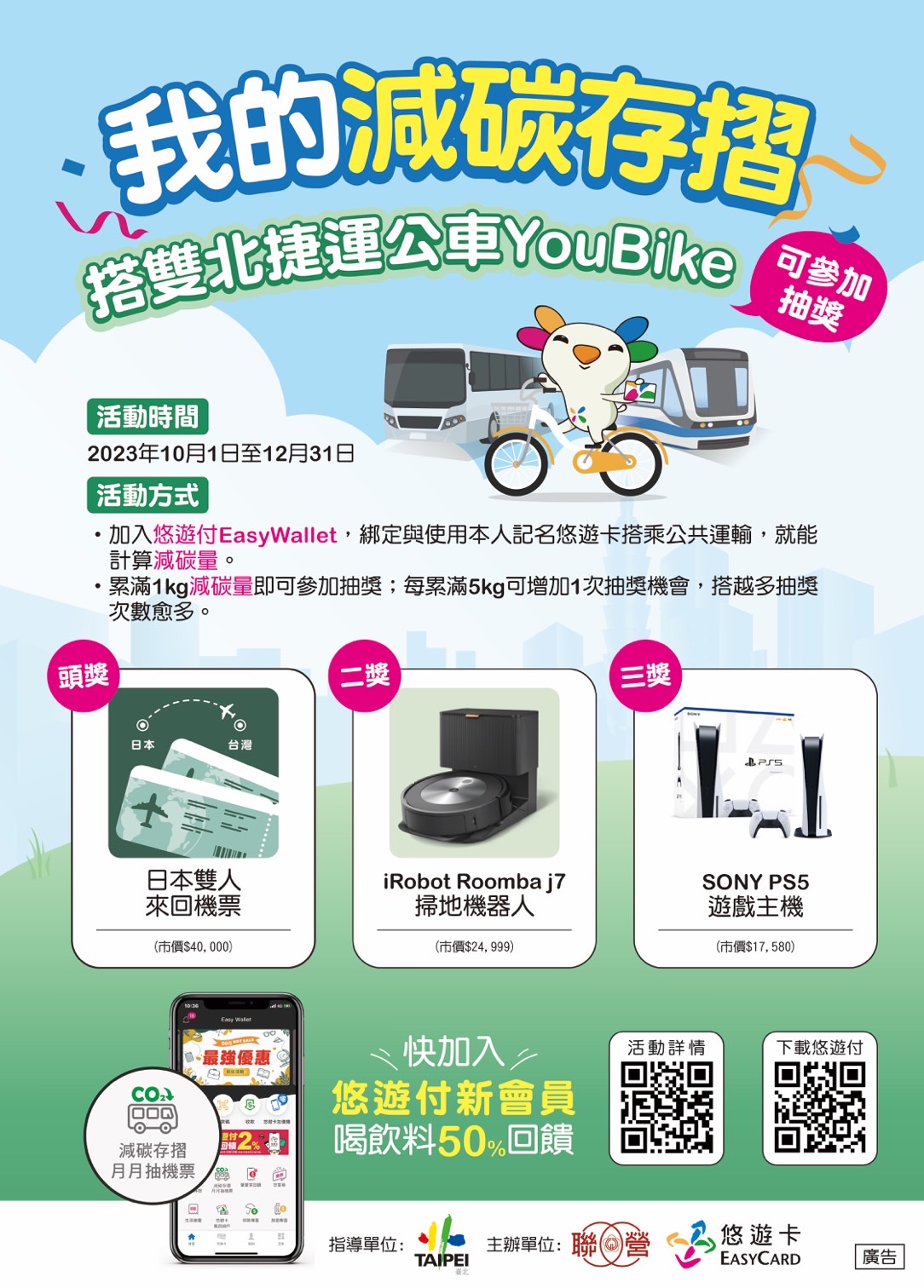 二、活動於112年10月1日至112年12月31日止,只要加入 「悠遊付Easy Wallet」APP會員,綁定與使用本人記名悠遊卡,搭乘雙北公共交通運具(公車、捷運、輕軌及 YouBike)就能計算減碳量。累計滿1kg減碳量即可獲得當月抽獎資格1次,每累計滿5kg,可再增加1次抽獎機會,累計滿10kg則多2次,以此類推,搭乘公共運輸越多,就有越 多中獎機會。