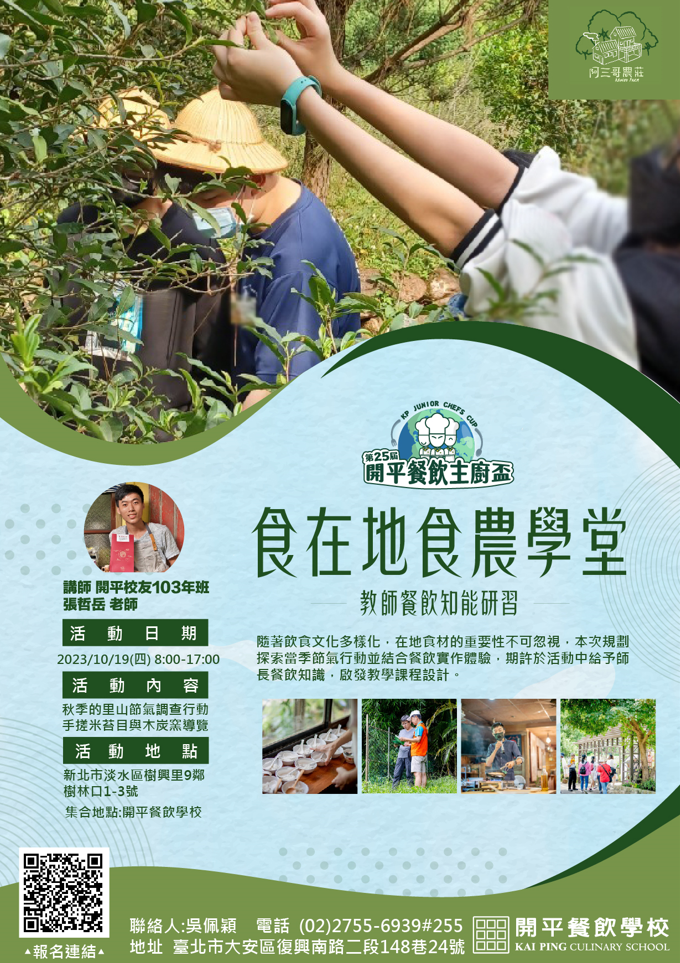 報名方式:採線上報名,請上”全國教師在職進修資訊網” 報名,課程名稱:食在地食農學堂-教師餐飲知能研習,課 程代碼:4043835。報名截止日期:2023/10/15,課程名單 將於開課前三天確認遴選名單。