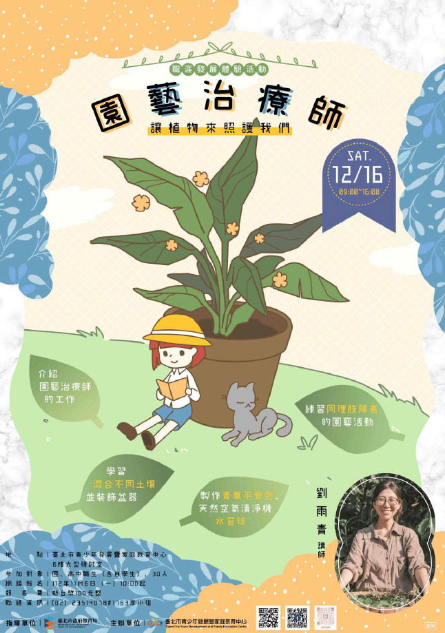 (2)製作青草平安包、天然空氣清淨機水苔球,以及練 習同理肢障者的園藝活動。詳情可至青發家教中心 官網報名系統(https://reurl.cc/V4plo6)查 詢。