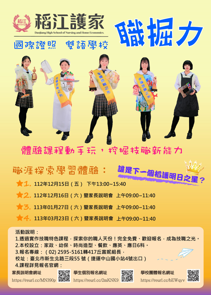 二、於112年12月15日(五)、12月16日(六)、113年1月27 日(六)、113年3月23日(六)辦理「稻江護家職掘力實作體 驗」,邀請八、九年級學生及家長共同參與。