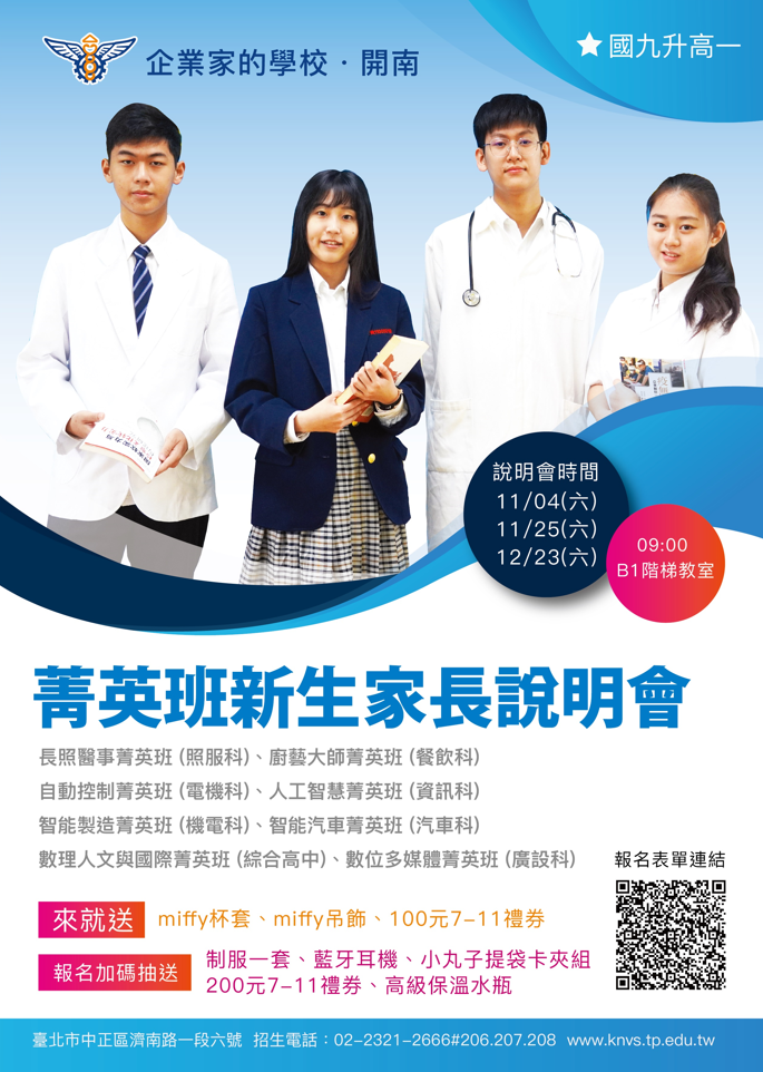 二、該校於112年11月4日、11月25日、12月23日(星期六)上 午09:00~11:30辦理「菁英班新生家長說明會」,邀請 國九家長暨子弟參加