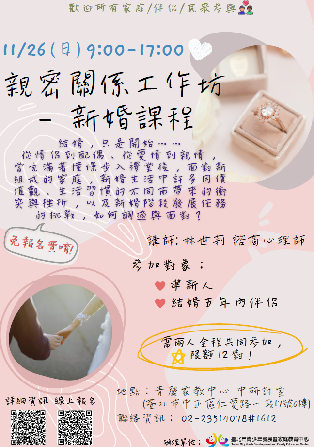 歡迎參加臺北市青少年發展暨家庭教育中心11月 26日「親密關係工作坊-新婚課程」,