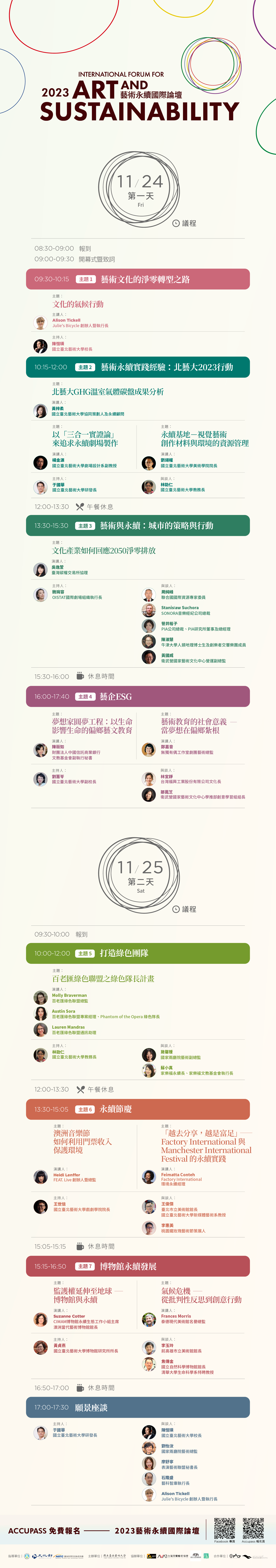 1、一般報名者請至Accupass活動通網站搜尋「藝術永續國際論壇」,於112年11月23日(星期四)17:00前完成線上報名(網址:https://reurl.cc/Y0GQYa)。