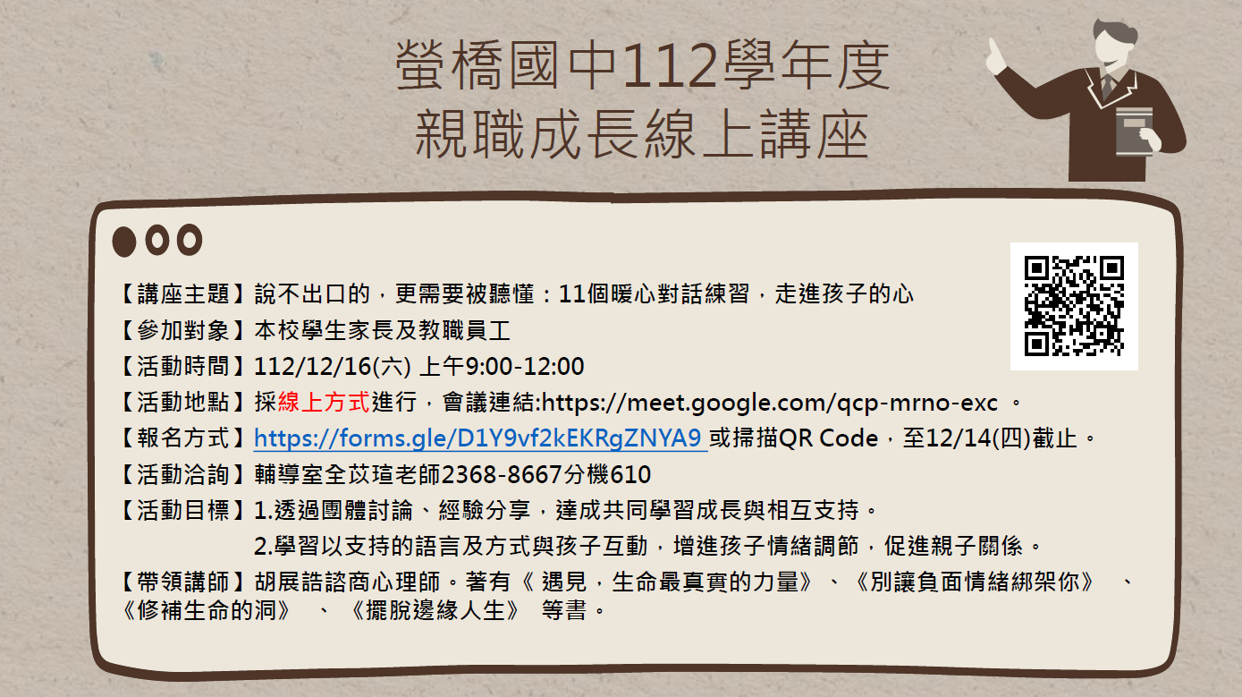一、講座主題:「說不出口的,更需要被聽懂:11個暖心對話 練習,走進孩子的心」