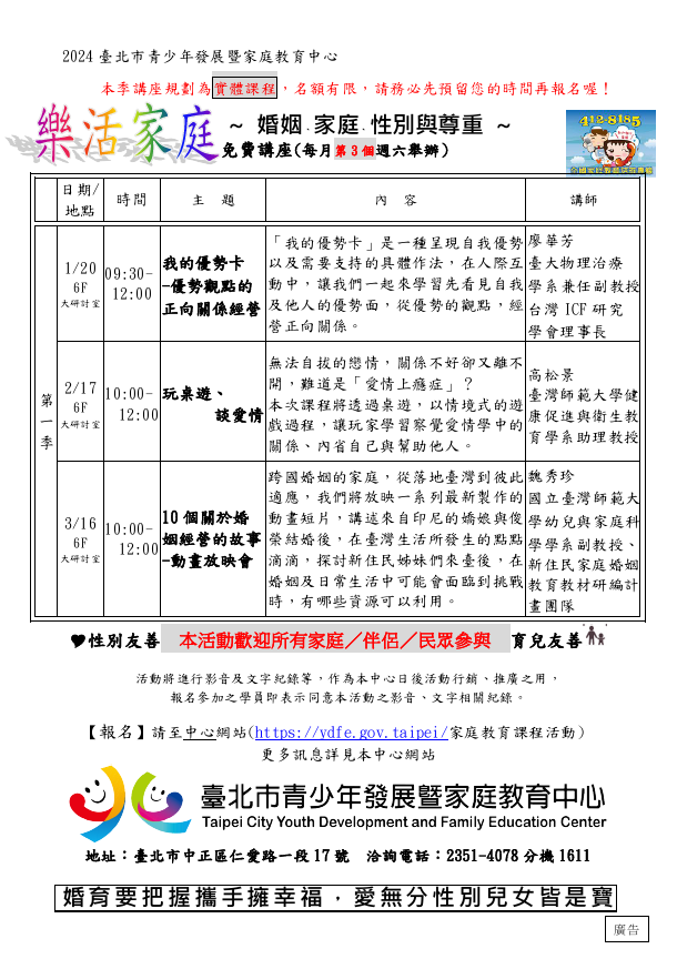青發家教中心免費講座:1月20日「我的優勢卡—優勢觀點的正向關係經營」、2月17日「玩桌遊、談愛 情」、3月16日「10個關於婚姻經營的故事—動畫放映 會」,歡迎踴躍參加。