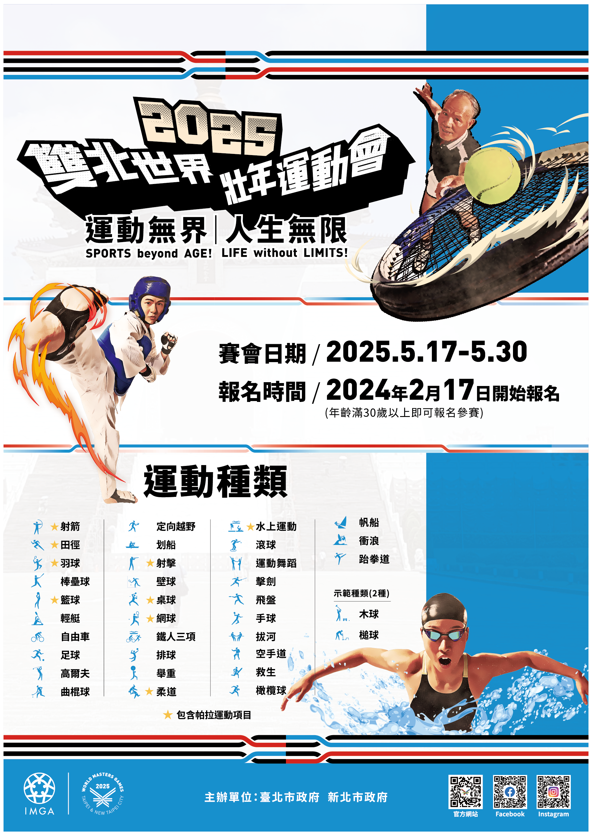 2025雙北世界壯年運動會於2025年5月17至30日舉行,共有35種運動種類其中包含帕拉運動組別,年 滿30歲無需選拔即可參賽,113年2月17日官網開放報名,等你一起和世界挑一場!