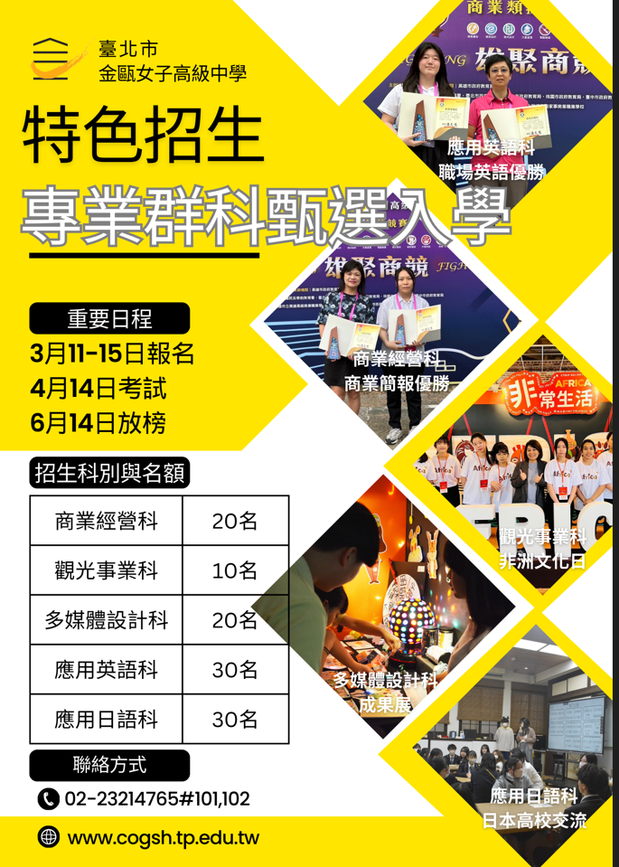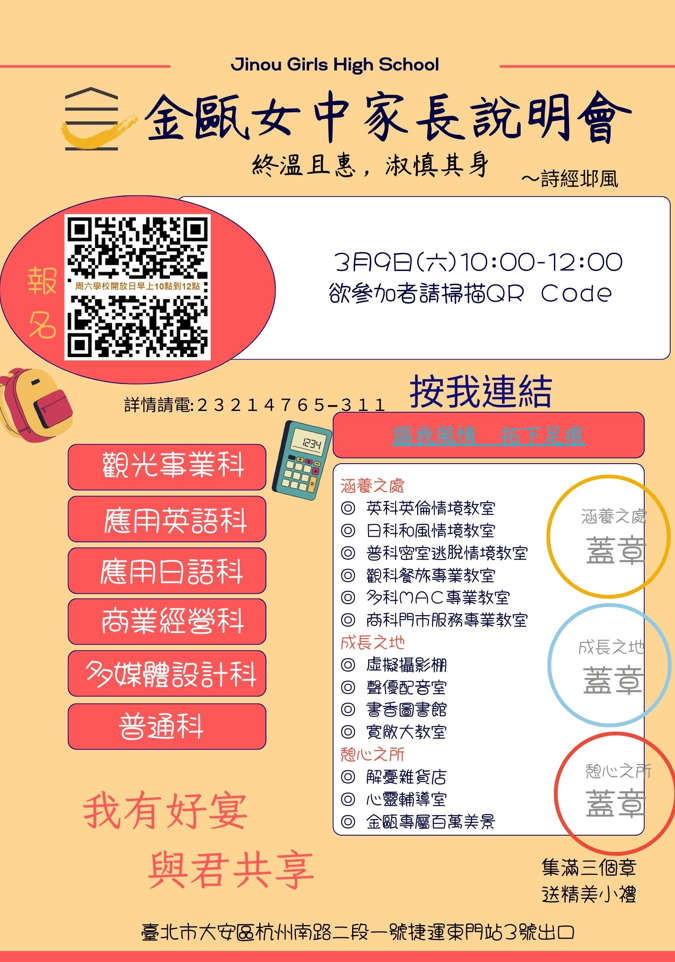 一、旨揭【特色招生家長說明會】活動定於民國113年3月9日(星期六)上午10時至12時於金甌女子高級中學辦理。