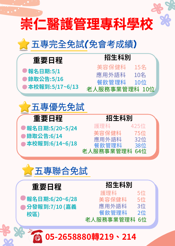 三、五專免試入學說明會海報及招生資訊請見附件。