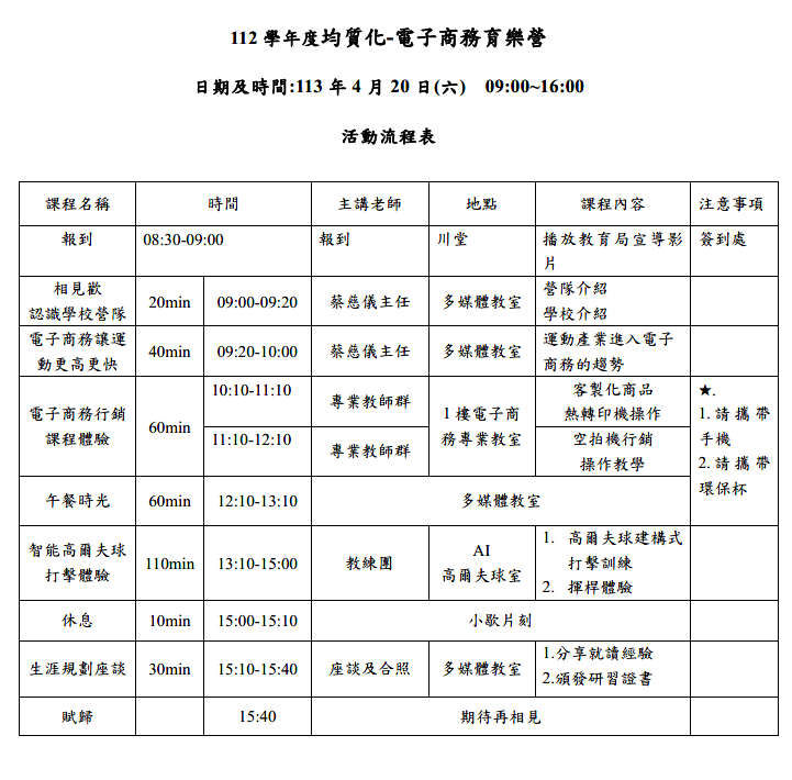 (五)課程:客製化商品熱轉印機操作、空拍機行銷操作、智能高爾夫球打擊體驗。