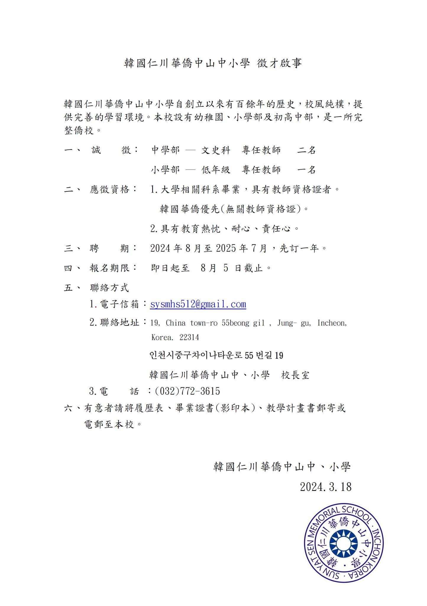 二、旨揭僑校擬招聘教師數名,其條件及待遇等資料詳徵才資