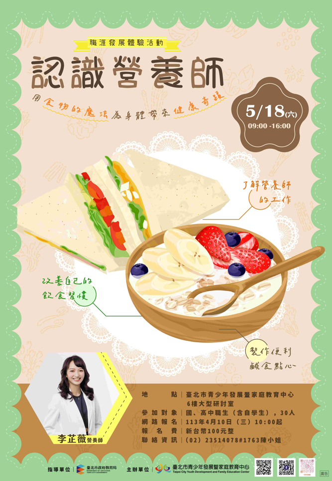 1、介紹營養師的工作與價值、均衡飲食原則、飲食與常 見疾病關係及改善青春期常見困擾的飲食要點。