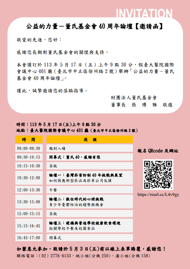 本次論壇資訊請參考附件與網址(https://reurl.cc /r9xzYO),本活動採預先報名制,報名時間為即日起至5/3 (五)下午五時止。 此次研習活動費用全免,全程參與者,備有午餐。