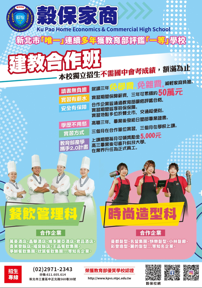 一、穀保高級家事商業職業學校建教合作班為新北市唯一連續七年評鑑一等的優質學校,招生科別:輪調式時尚造型科及輪調式餐飲管理科。