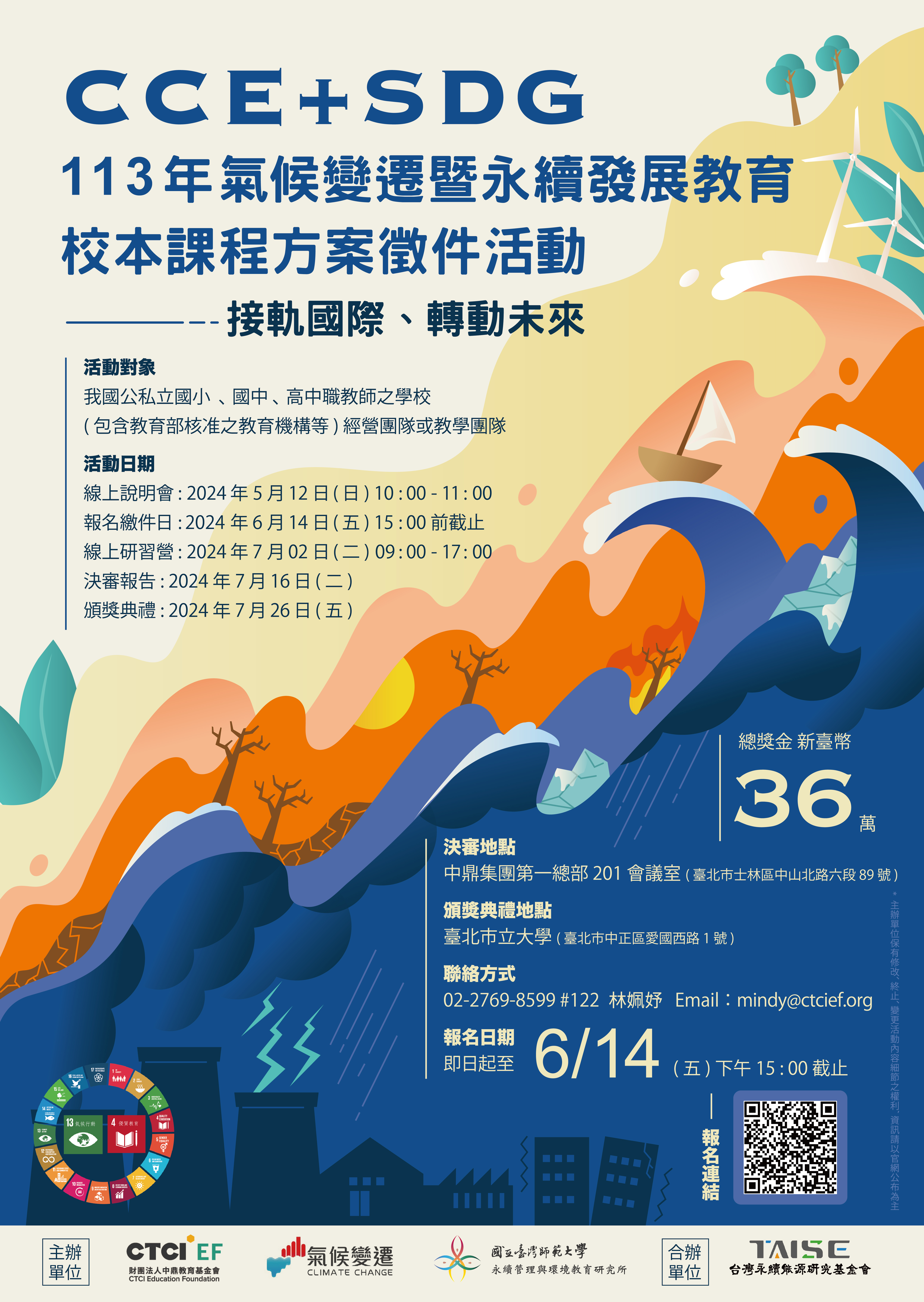 為強化我國教育人員對於氣候變遷教育(CCE)、永續發展教育(ESD)與聯合國永續發展目標(SDGs)之認識,朝向「氣候變遷暨永續發展教育」(CCESD=CCE+ESD)國際趨勢邁進,連結永續發展目標(SDGs)後,成為CCESDG,於各級學校推動 『以永續發展為導向之氣候變遷教育』。中鼎教育基金會 (CTCIEF)特與教育部氣候變遷教學資訊平臺氣候變遷教育推動計畫、國立臺灣師範大學永續管理與環境教育研究所及台灣永續能源硏究基金會(TAISE)共同籌辦旨揭徵件活動,以鼓勵教師研發與編製「氣候變遷暨永續發展教案」。
