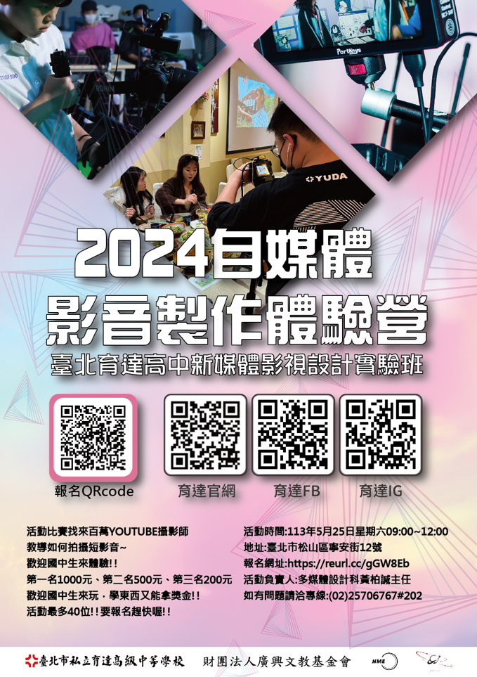 一、育達高中以掌握趨勢,培育達人作為宗旨,希望能夠讓更 多學生及早學習職場技能,在業界成為佼佼者。「新媒體 影視設計實驗班」為國內首創,本次活動找來百萬 YOUTUBER攝影師、東森攝影記者教導如何拍影片及製作短 影音拍YOUTUBE、攝影直播等專業技能,歡迎國中生來體 驗!!