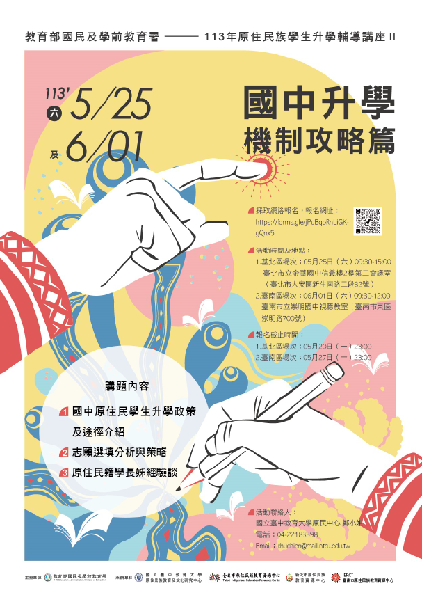 2、為深化高級中等以下學校原住民學生升學輔導及適性 發展,請各校輔導教師踴躍報名參加。