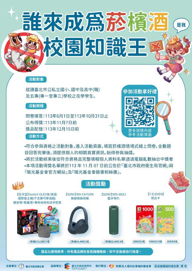 統計報告指出口腔癌為臺灣十大癌症死亡率第6名,其中檳榔、菸品及酒類為口腔癌三大危險因子;惟本市國中、高 中(職)學生對於嚼檳榔危害認知率僅達58.94%及 46.50%。有鑑於青少年時期健康行為,將影響其成人健康狀況,期藉由旨揭健康促進活動,培養學生健康識能。