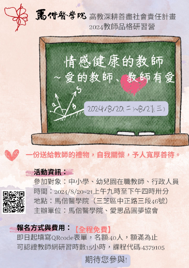 一、活動目的:提供北海岸教師在職進修的學習。本研習包含 教師與自我、教師與親友你我、群我的關係:「愛與接納 自己」、「失落收尾學」、「和諧粉彩癒身心」、「好好 告白與拒愛」、「成為情感成熟的大人」等實用的課程。
