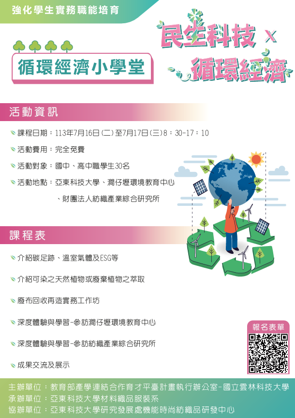 (四)上課地點:亞東科技大學(60201、60422、機能時尚紡織 品類產線基地)、澗仔壢環境教育中心、紡綜所