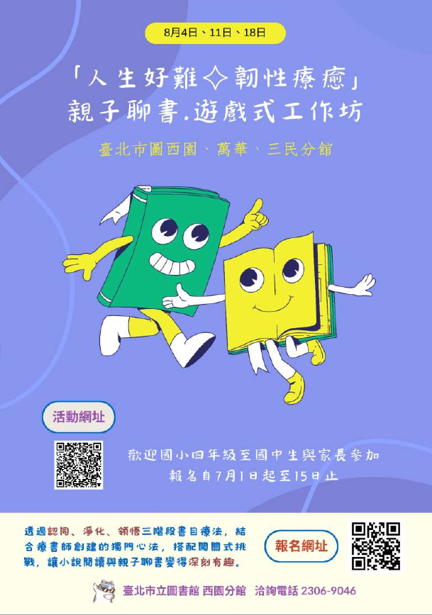 工作坊參加對象為國小4年級至國中學生及其家長,報名時 間自113年7月1日起至7月15日止,活動採線上報名,報名 網址:https://reurl.cc/QRZrq0。