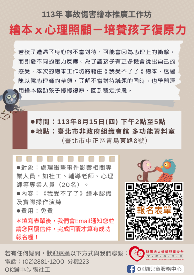 (五)報名方式:掃描附件中QR Code表單填寫,OK繃兒童服務 中心完成回覆方報名成功。
