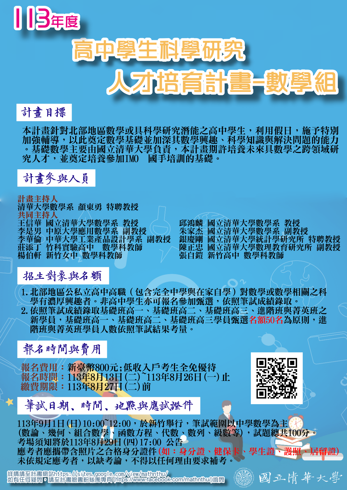 清華大學數學系承辦教育部113學年「高中學生科學研究人才培育計畫-數學組」招生簡章,鼓勵數學或具科學研究潛能之學生踴躍報名參加。