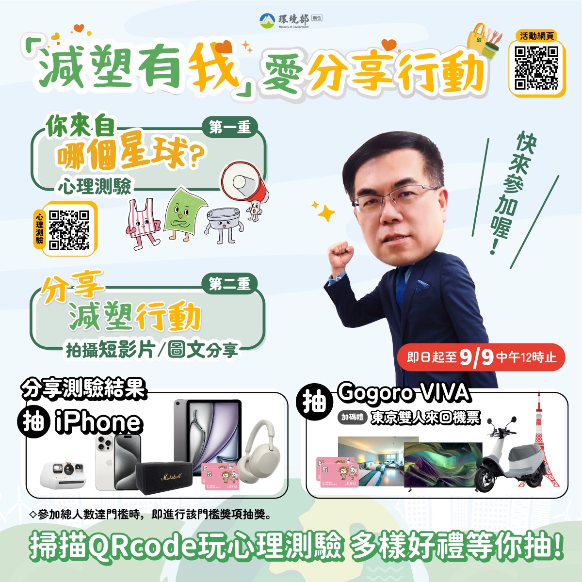 環境部為鼓勵社會大眾及莘莘學子一起跟上全球減少塑膠的風潮,特辦理「減塑有我」愛分享行動,可透過臉書 (Facebook)、Instagram(IG)等社群媒體,拍攝個人生活中減塑短影片、減塑生活照片,並可透過參加「你來自哪個星球?」心理測驗遊戲,瞭解並發覺屬於自己獨特的環保行動,歡迎民眾邀請親朋好友一起在生活中響應減塑行動,參加旨揭活動拿大獎。