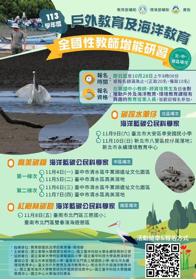 研習對象:在職國中小教師、師資培育生及日後對推動戶外及海洋教育或環境教育課程有興趣的教育從業人員,皆歡迎報名參加。