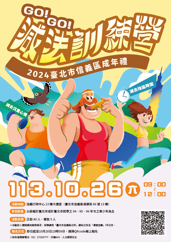 臺北市信義區公所113年度成年禮活動,訂於113年10月26日(星期六)上午9時舉辦,活動為實境解謎遊戲,凡成功報名並全程參與之禮生,可獲得成年禮紀念禮品,並有機會獲得精美獎品及禮券。即日起開放報名,內容豐富精彩,歡迎設籍或就讀於臺北市學校之青年男女(民國94至96年次)踴躍報名參加。