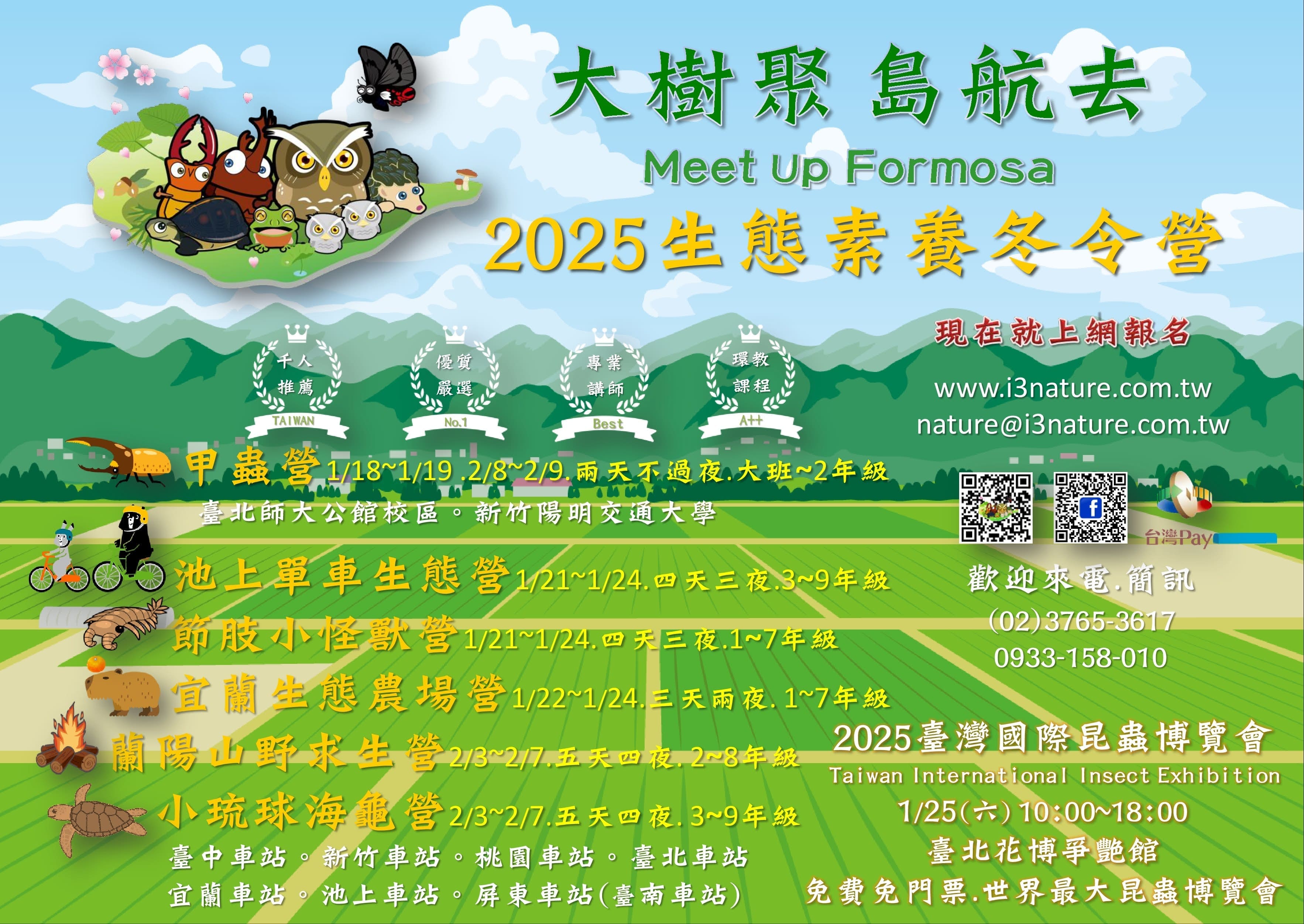 2025生態素養冬令營日期1/18~2/9,招生涵蓋大班-九年級 學員,依不同課程分齡參加,詳細請見網站 www. i3nature.com.tw 。