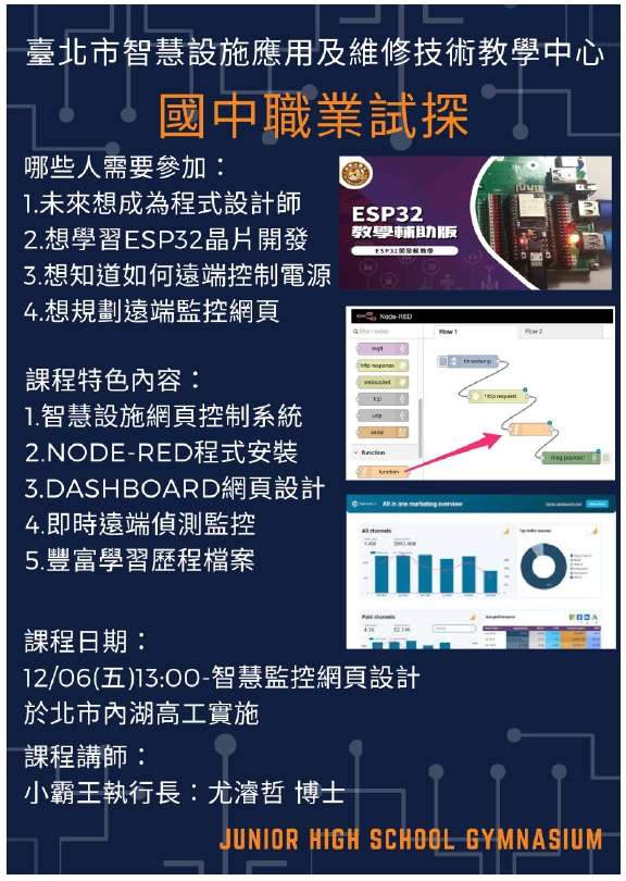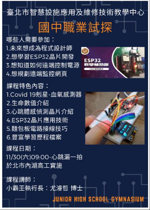 三、參與對象:臺北市公私立國中學生皆可報名,每場次各招收18位學生,完成課程者可獲得修習證明。