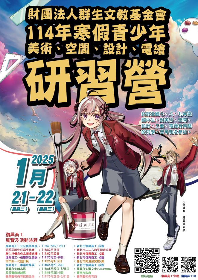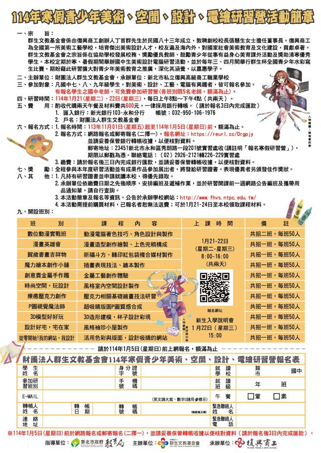 三、參加對象:凡全國國中七、八、九年級,對美術、設計、 工藝、電腦有興趣者,皆可報名參加,有報名學生之國中老師,可免費參加研習營(各班別限5名老師,額滿為止)。