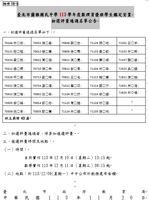 113朲數理資優班鑑定安置--複選評量時間及地點: