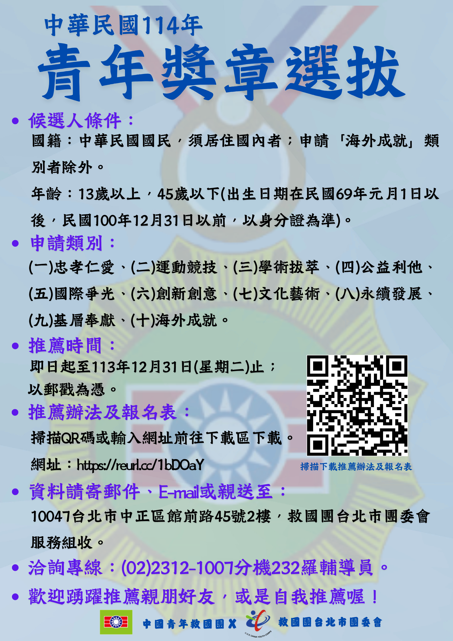 煩請將候選人推薦表及相關證明文件或佐證資料,於113年 12月31日(星期二)前,寄送至中國青年救國團台北市團務指導委員會(臺北市中正區館前路45號2樓服務組收)。