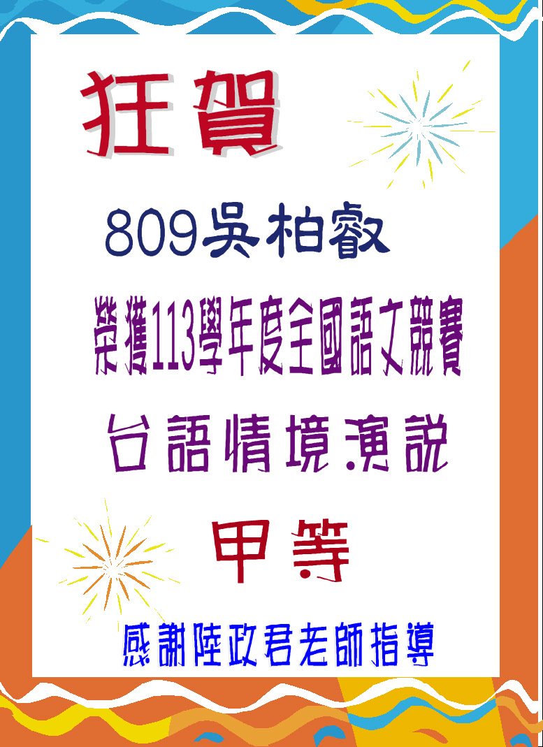 狂賀!809吳柏叡榮獲113學年度全國語文競賽台語情境演說甲等,感謝陸政君老師指導。