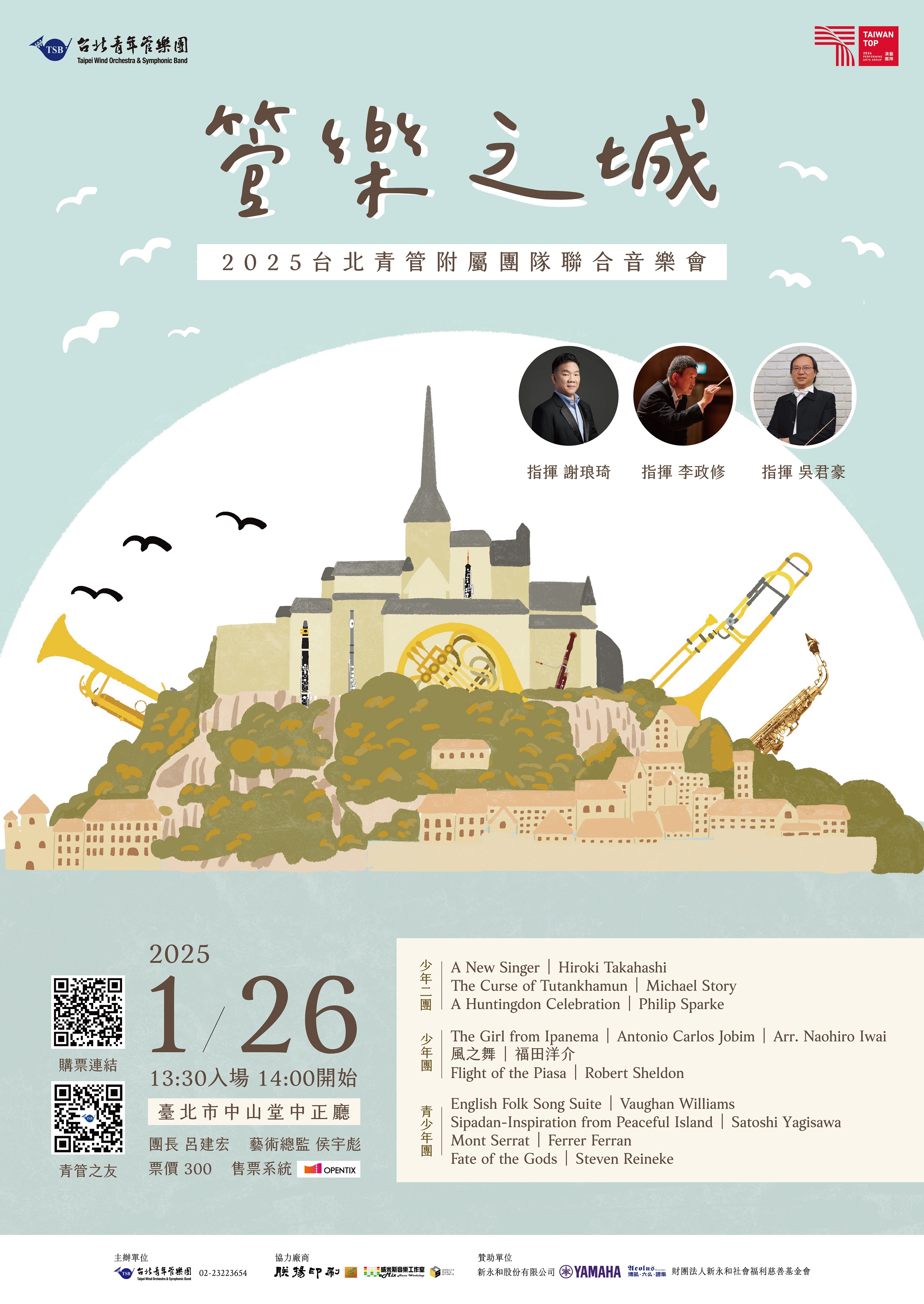 2025台北青管附屬團隊聯合音樂會,由謝琅琦、李政修與吳君豪3位老師,指揮台北青管附屬團隊演出,帶來一連串耳熟能詳的管樂經典曲目。