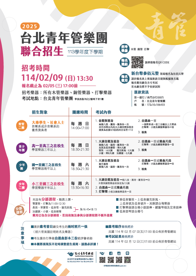(四)相關招生資訊請至台北青年管樂團臉書粉絲專頁查詢(https://www.facebook.com/tsbgroup/)。