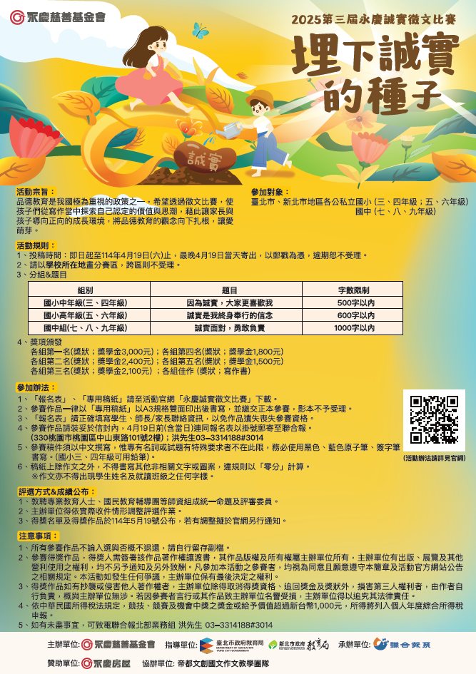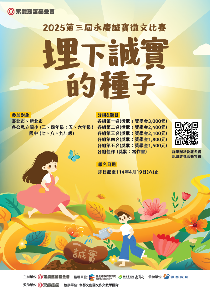 旨案乃為透過徵文活動,培養學生對於生活的觀察力, 並從寫作中探索自我價值與思潮,讓品格教育的觀念向下扎根,以「埋下誠實的種子」為主題,希望學生從將品格素 養融入文字的過程中,亦將優良德行落實於日常生活、徵文活動內容摘要如下:
