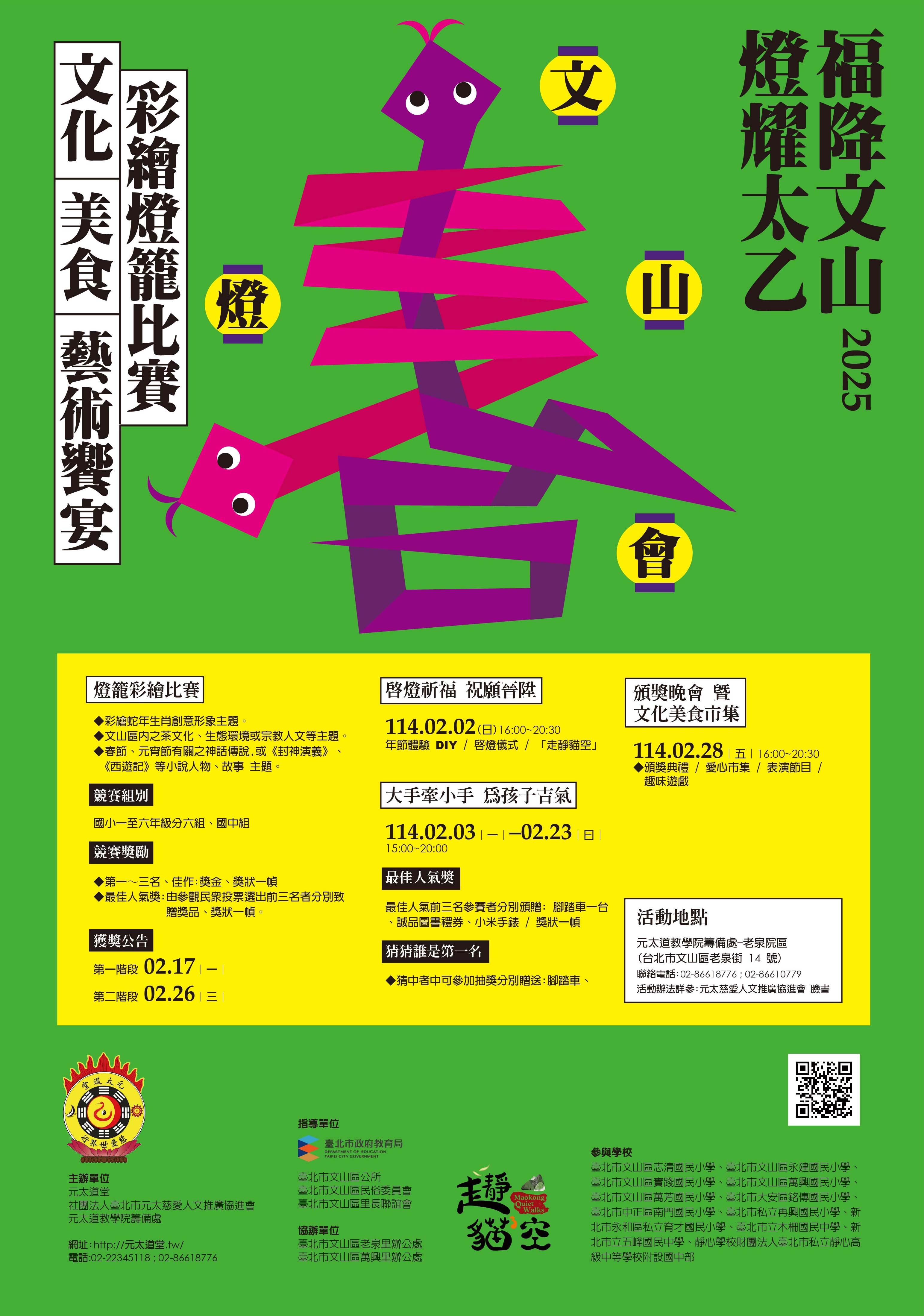 (一)點燈儀式:114年2月2日下午4時至6時,屆時將安排傳統 元宵燈節搓元宵、持火把、走靜貓空等活動。